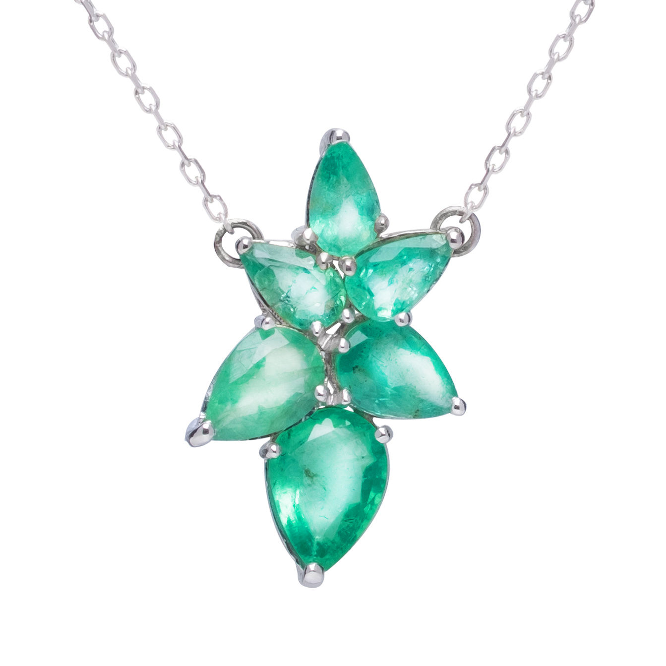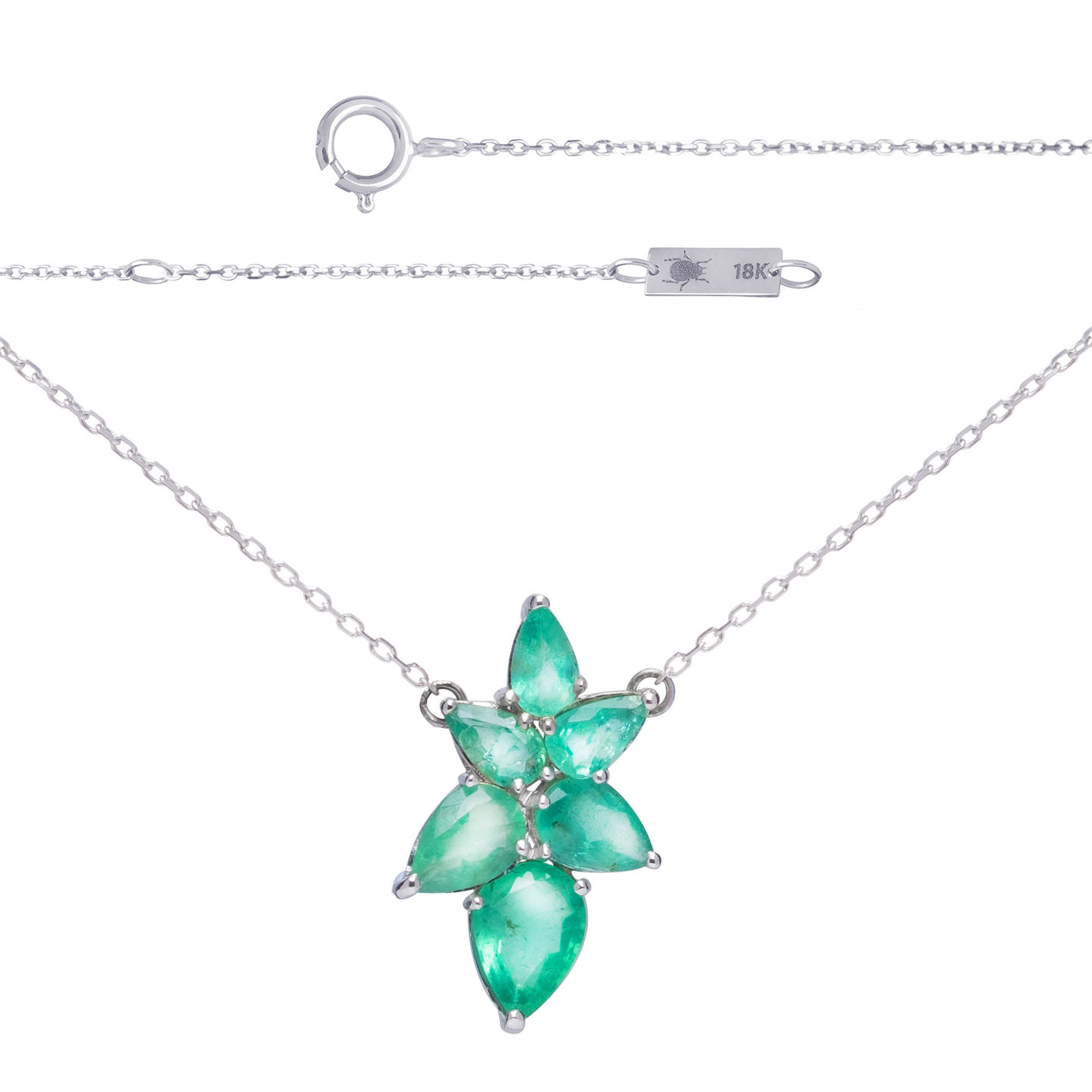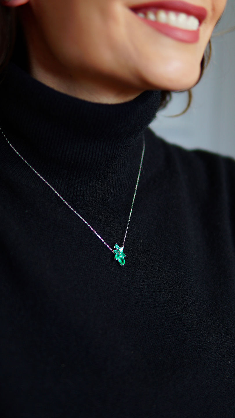 Este colar exibe esmeraldas deslumbrantes em formato de folha que apontam para cima, cada esmeralda é posicionada em diferentes ângulos, proporcionando uma sensação de movimento e leveza.